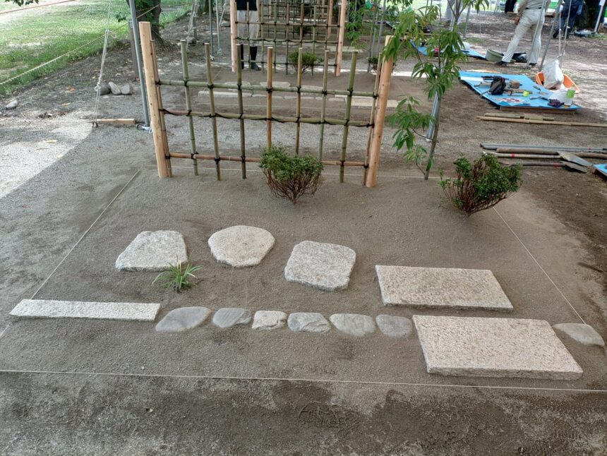 丸太や竹を切る作業・穴を掘り丸太を立てる・竹を立ててシュロ縄で結ぶ作業・ライン出しをして石を据える作業など、どの工程も練習し精度を上げることもとても大事ですが、各工程で必要以上に汚さずにある程度整地しておく事で最終の整地作業に負荷がかからずより整った地表を見せることが出来るからです。